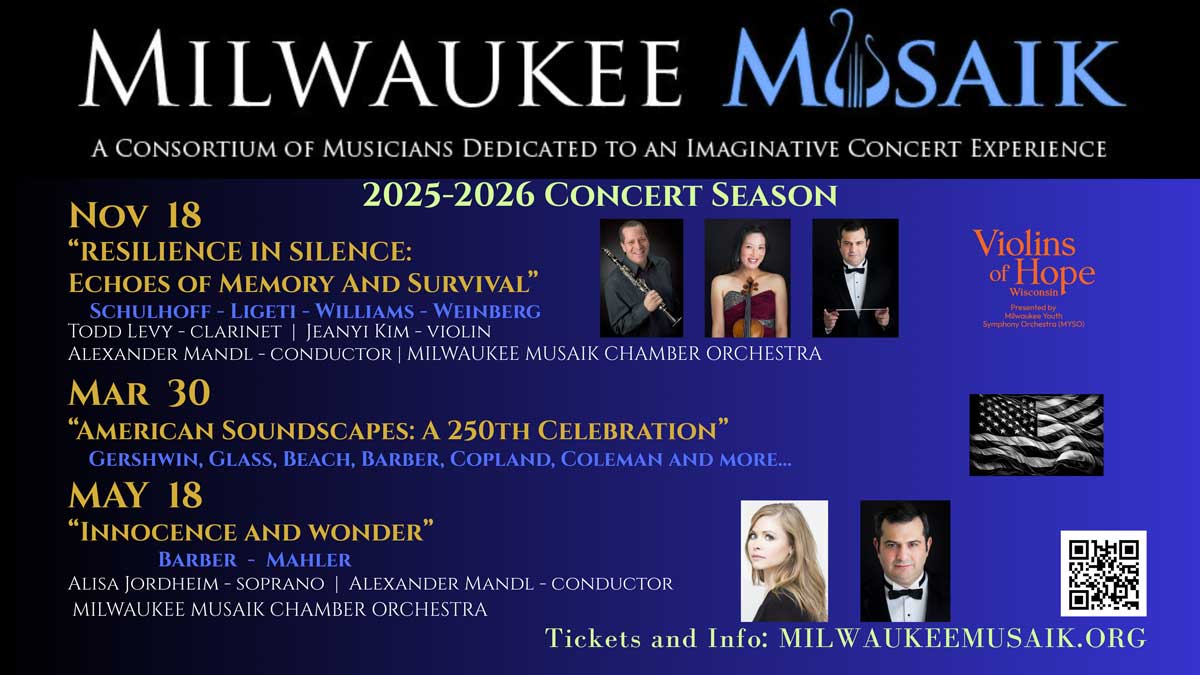 The Milwaukee Musaik Chamber Orchestra opens the season in wonderful acoustics of Wauwatosa Presbyterian Church on November 18, 2025 with Resilience in Silence: Echoes of Memory and Survival. This Holocaust education centered concert brings to light works by Jewish composers who suffered the effects of persecution and oppression. Instruments from the Violins of Hope collection will bring to life the voices of those who sadly were silenced. To continue as a community artistic partner of the Violins of Hope Wisconsin residency, Milwaukee Musaik artists will perform on January 11, 2026 in the Sharon Lynn Wilson Center concert series (click here for details). On March 30, 2026 we will visit the intimate Helen Bader Recital Hall at the Wisconsin Conservatory of Music for an eclectic chamber music evening - American Soundscapes: A 250th Celebration. On May 18, 2026, we present a spectacular season closer Innocence and Wonder concert with Milwaukee area soprano Alisa Jordheim and Musaik Chamber Orchestra. Led by conductor Alexander Mandl, the visions of a young boy are depicted in works by Samuel Barber and Gustav Mahler. This is a not-to-be-missed event at the Wauwatosa Presbyterian Church. Distinguished for its unusual programming and stellar musician roster, Milwaukee Musaik juxtaposes timeless classics with the new and unfamiliar. (Please click on concert title links for tickets and detailed info.)
